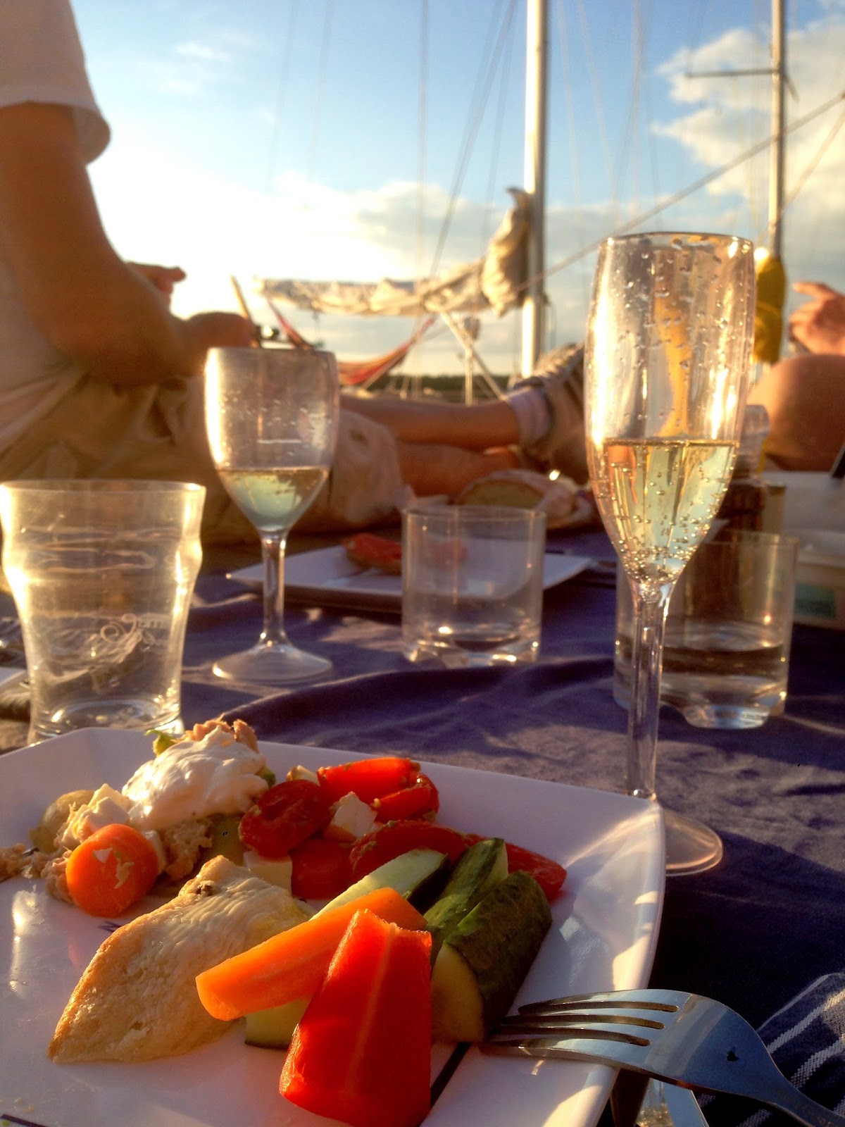 Saimme kuitenkin Alanmiehen kanssa upean tilaisuuden nähdä Suvisaaristoa, kun ystäväni Norppa ja hänen miehensä kutsuivat meidät maanantaina iltapurjehdukselle. (Kutsu taisi olla jo kolmas; aiemmin ei ole onnistunut, koska me ollaan kuulemma ”aina jossain”!) Mutta nyt: hellepäivä ja mulla vielä viimeinen viikko kesälomaa – ei tarvinnut kahdesti käskeä!