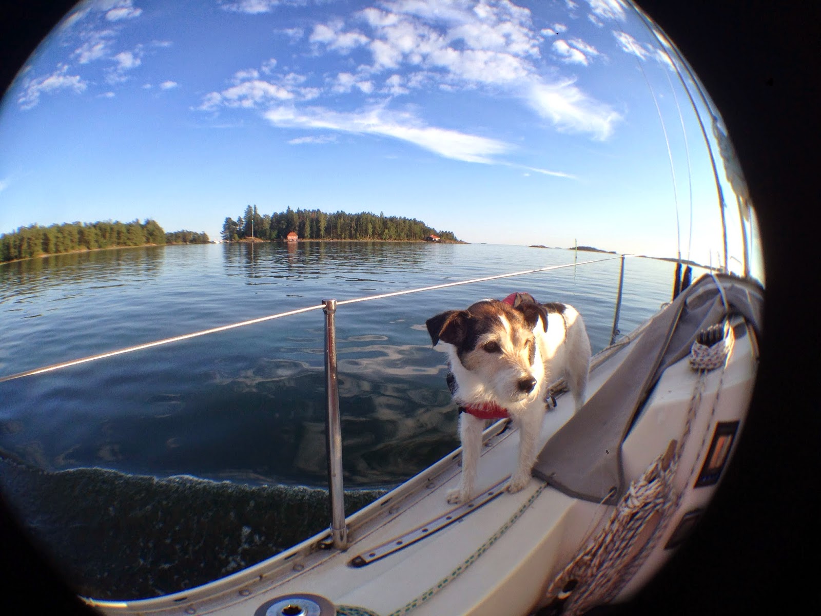 Kuuden maissa kurvasimme purjehduskerhon pihaan ja nostelimme ruuat ja virvokkeet Båtiin innokkaan Laivakoiran touhottaessa ympärillämme. Yritimme miehen kanssa olla mahdollisimman vähän tiellä, kun isäntäväkemme valmisteli purjeveneen lähtöön. Kävin vuosia sitten Tampereella asuessani muutaman illan mittaisen purjehduskurssin, mutta veneen opasta plärätessäni huomasin unohtaneeni aivan kaiken. Niinpä keskityin pukemaan pelastusliivit hauvelille ja itselleni. Norppa piti lyhyen turvakatasauksen ennen lähtöä (vaikuttavaa!), ja sitten köydet irti ja matkaan.